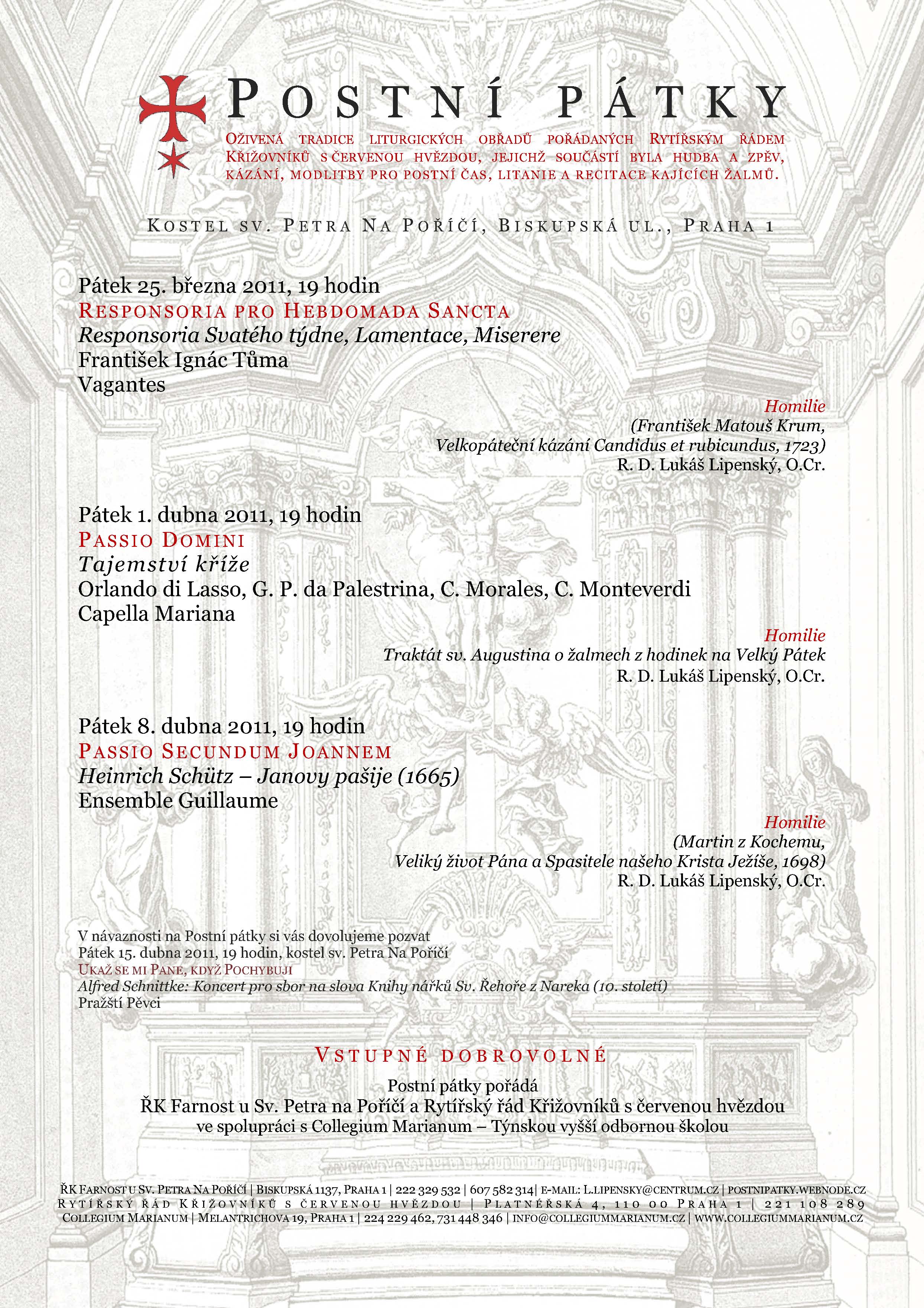 Oživená tradice Postních pátků navazuje na liturgické obřady pořádané pražskými Křižovníky v 18. století. Postní Pátky 2011 pořádá ŘK Farnost u sv. Petra Na Poříčí, Praha 1 ve spolupráci s Rytířským řádem Křižovníků s červenou hvězdou a s Collegiem Marianem – Týnskou vyšší odbornou školou.
